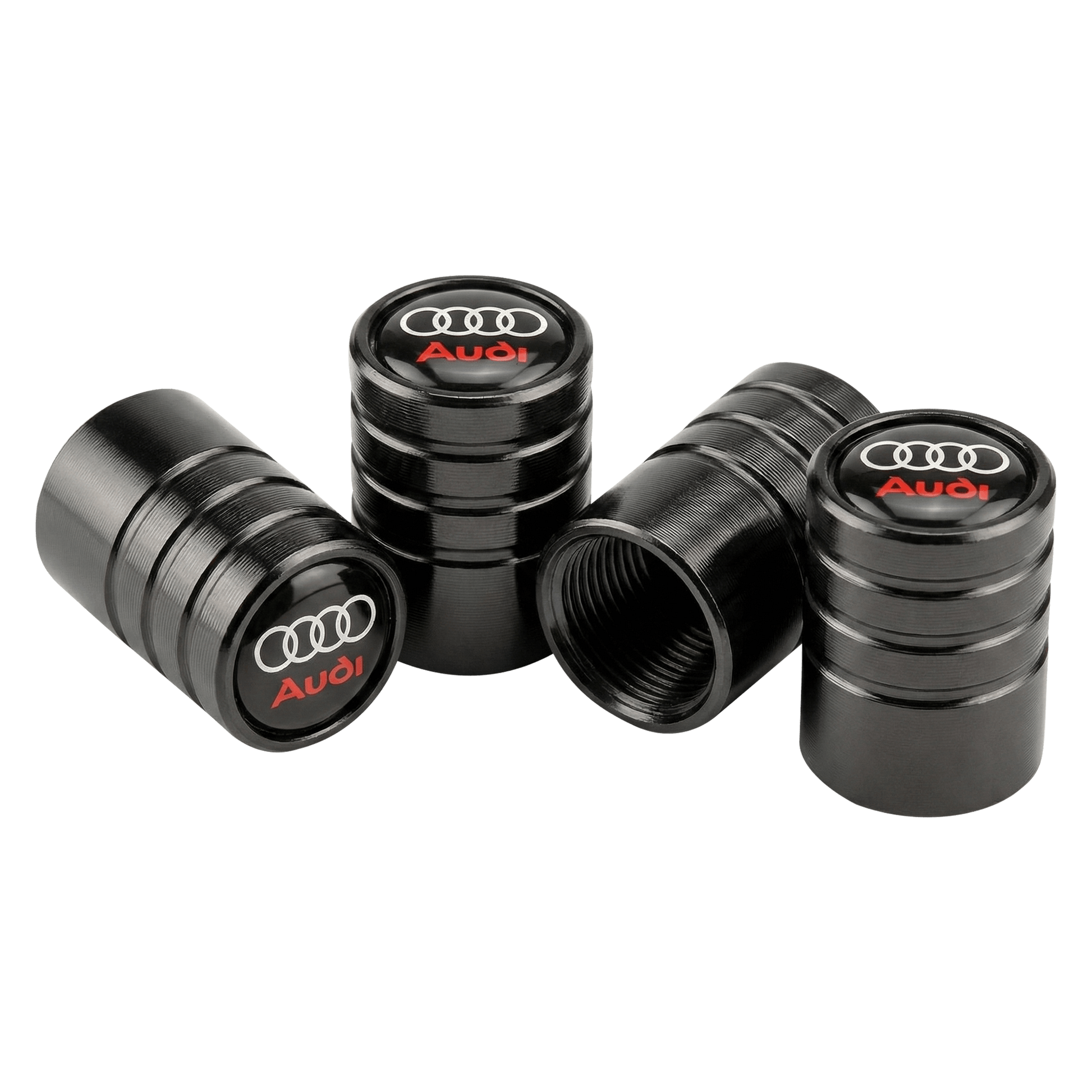 Tilføj en diskret men sportslig detalje til din Audi med disse sorte alu-ventilhætter med rød tekst.